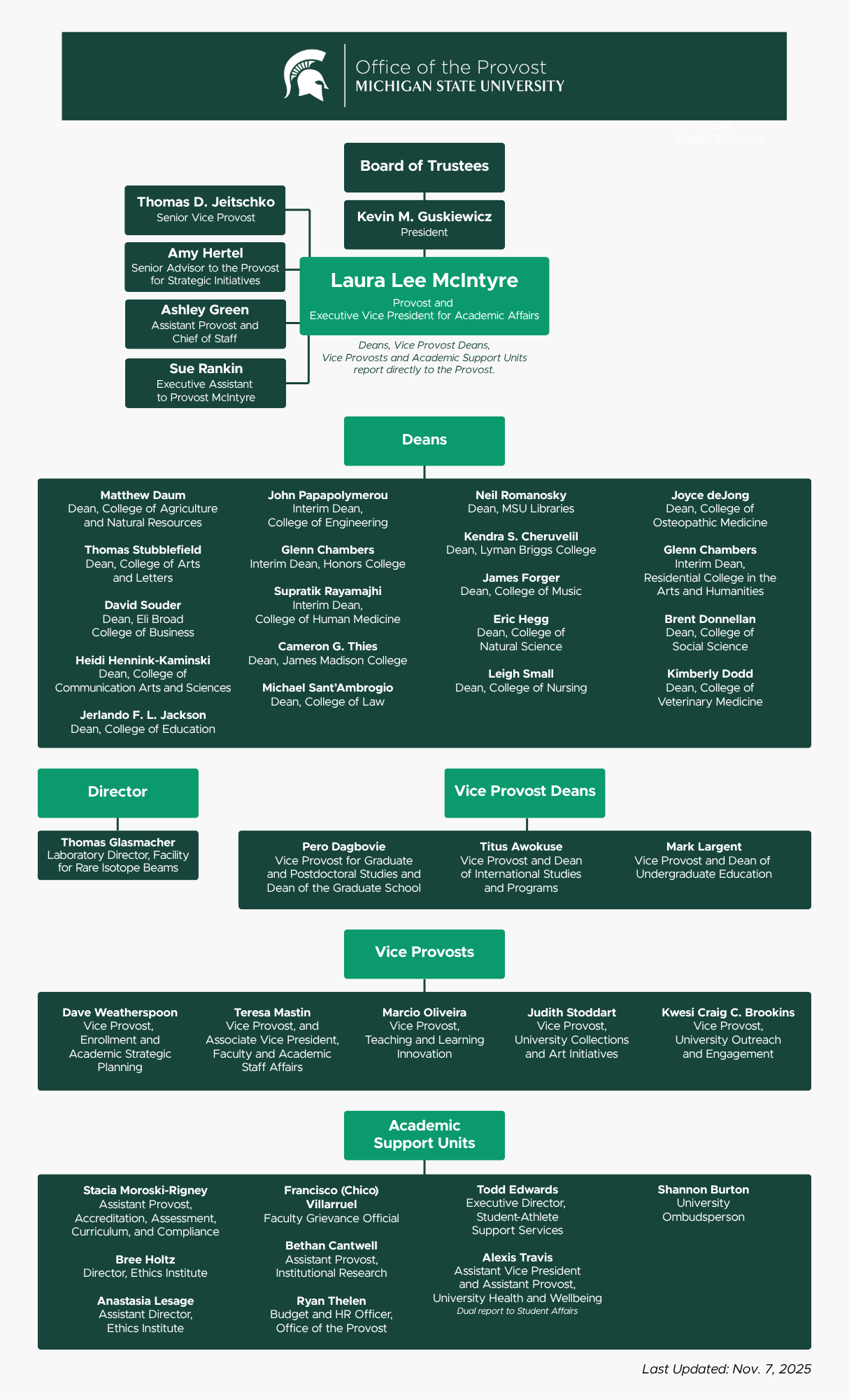 View the image version of the organizational chart, updated Nov. 7, 2025. View the accessible Word version, updated Nov. 7, 2025.
