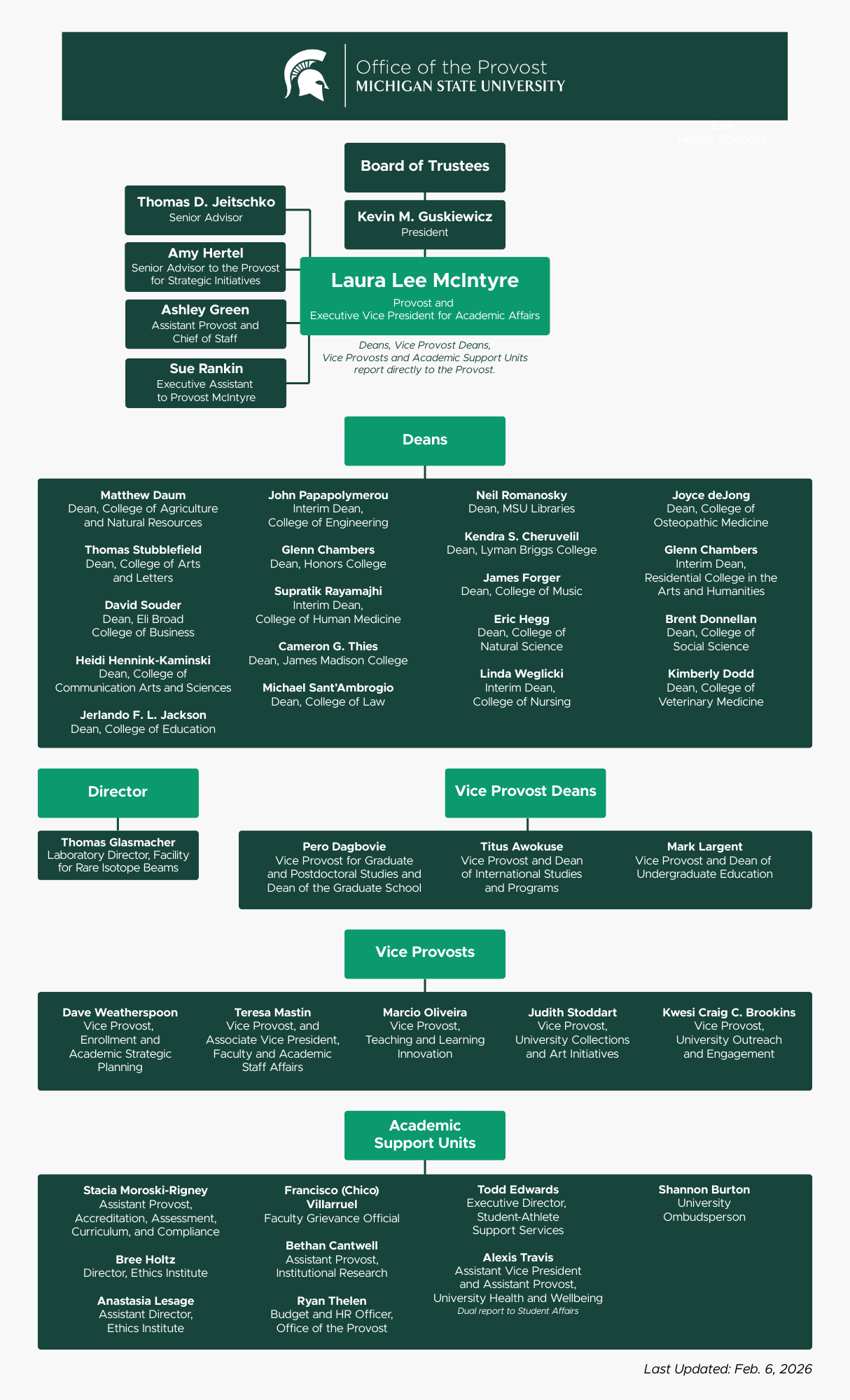 View the image version of the organizational chart, updated Feb. 6, 2026. View the accessible Word version, updated Feb. 6, 2026.